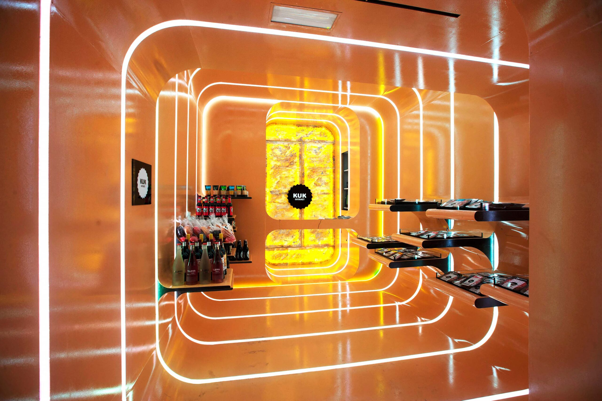 El proyecto combina una paleta cálida con iluminación integrada que guía el recorrido y resalta la exclusividad de los artículos gourmet. Más que una tienda, KUK Gourmet es una experiencia sensorial que refleja innovación, identidad y una nueva forma de entender el lujo gastronómico.