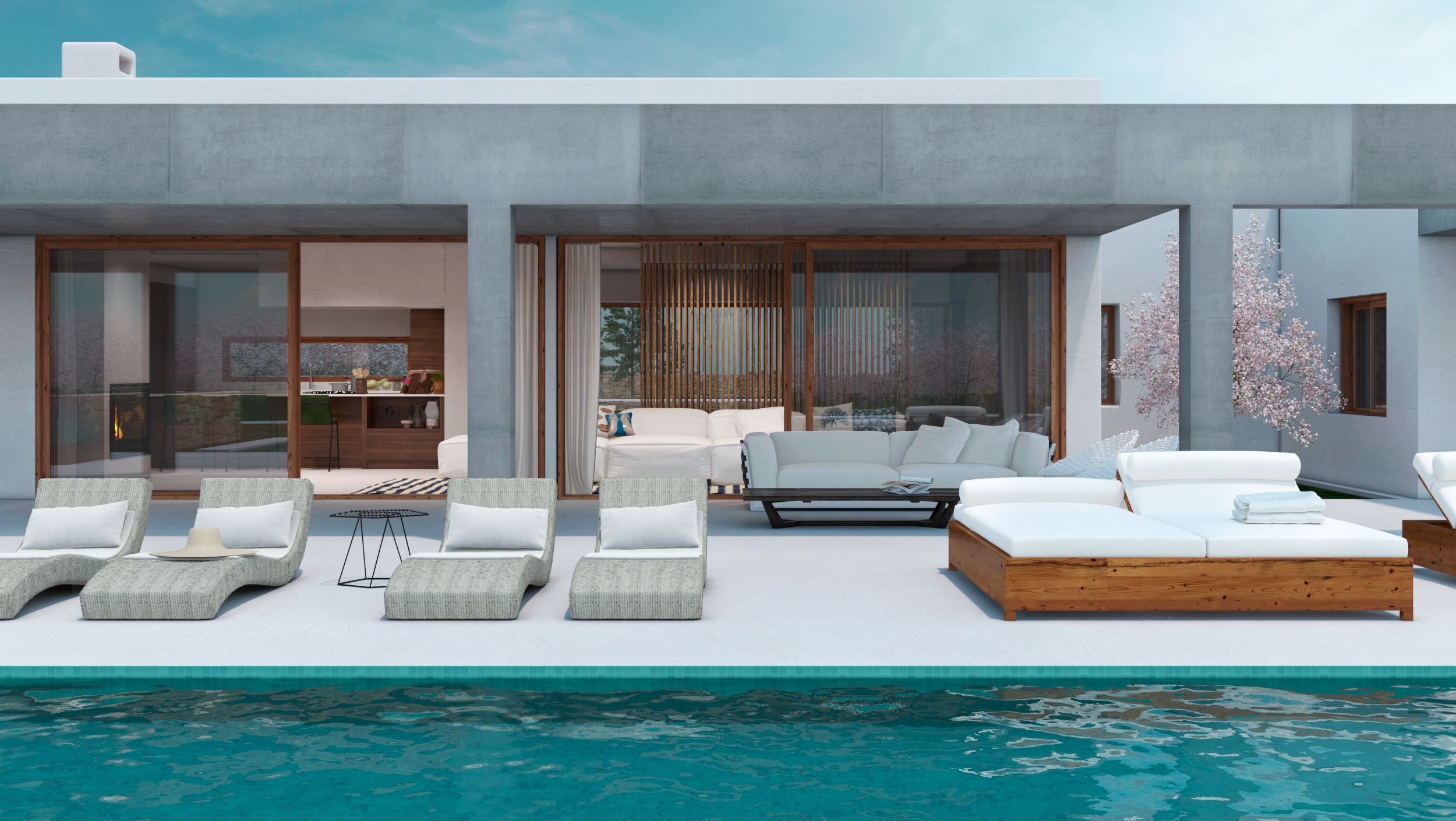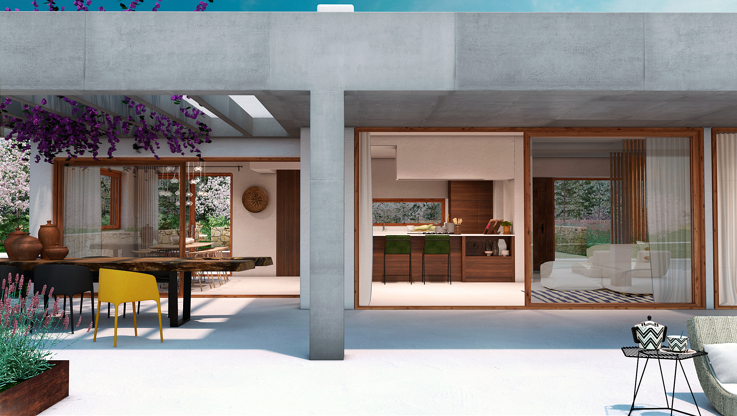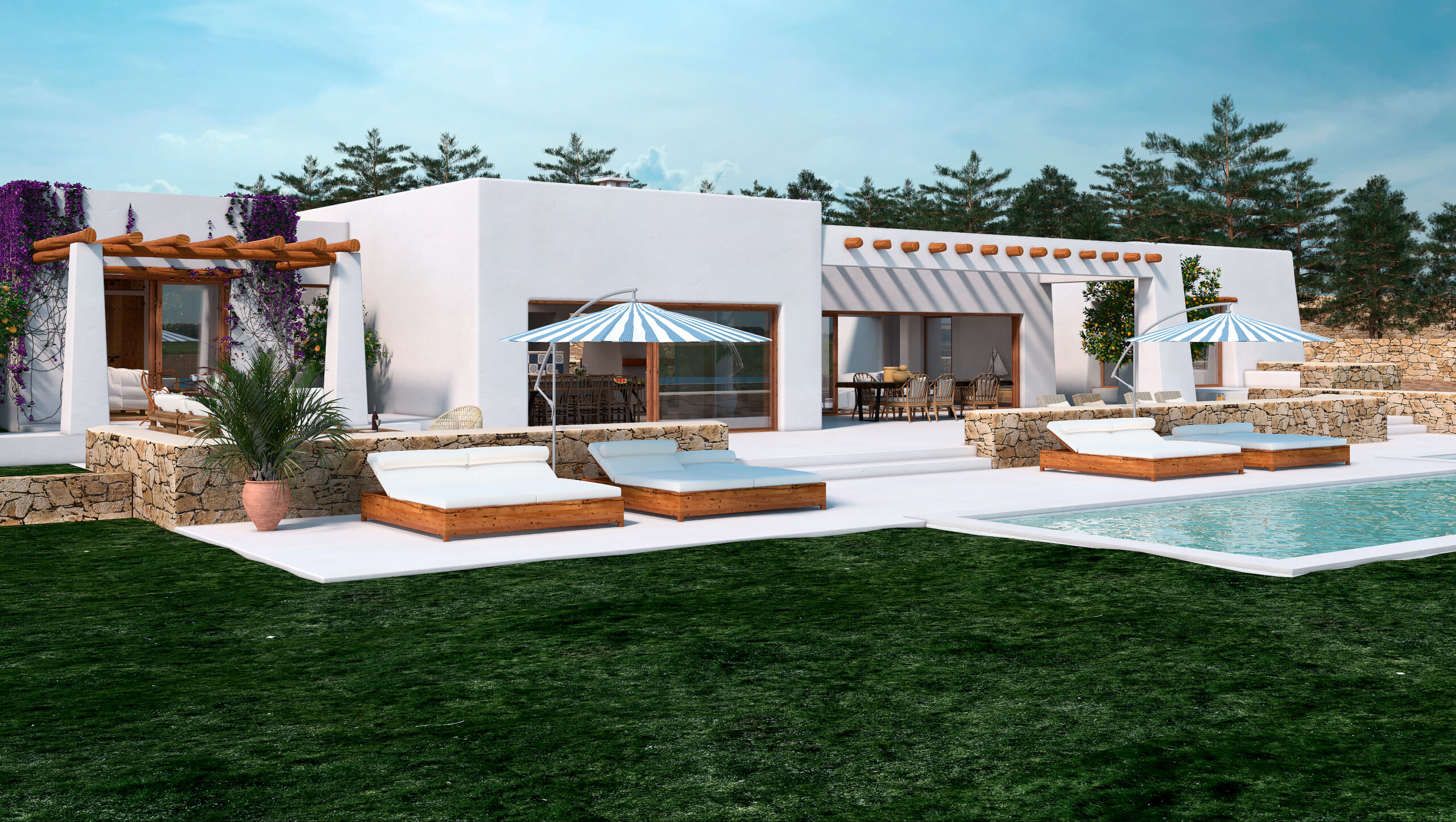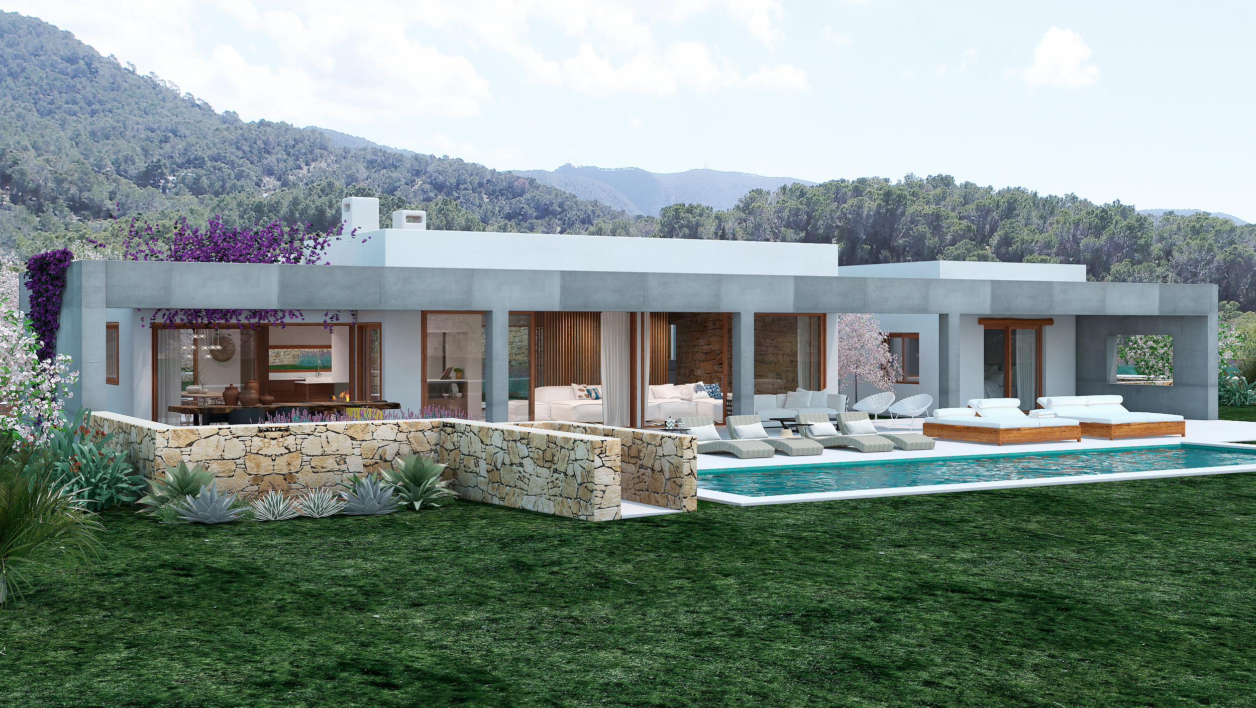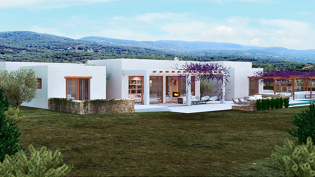 La arquitectura combina líneas contemporáneas con materiales naturales como la piedra, la madera y el estuco tradicional, logrando una estética cálida, elegante y atemporal. Cada villa cuenta con zona ajardinada, piscina individual y garaje, ofreciendo confort, privacidad y un vínculo constante con la naturaleza. El proyecto busca capturar la esencia de Ibiza: un equilibrio perfecto entre sencillez, sofisticación y respeto por el paisaje.