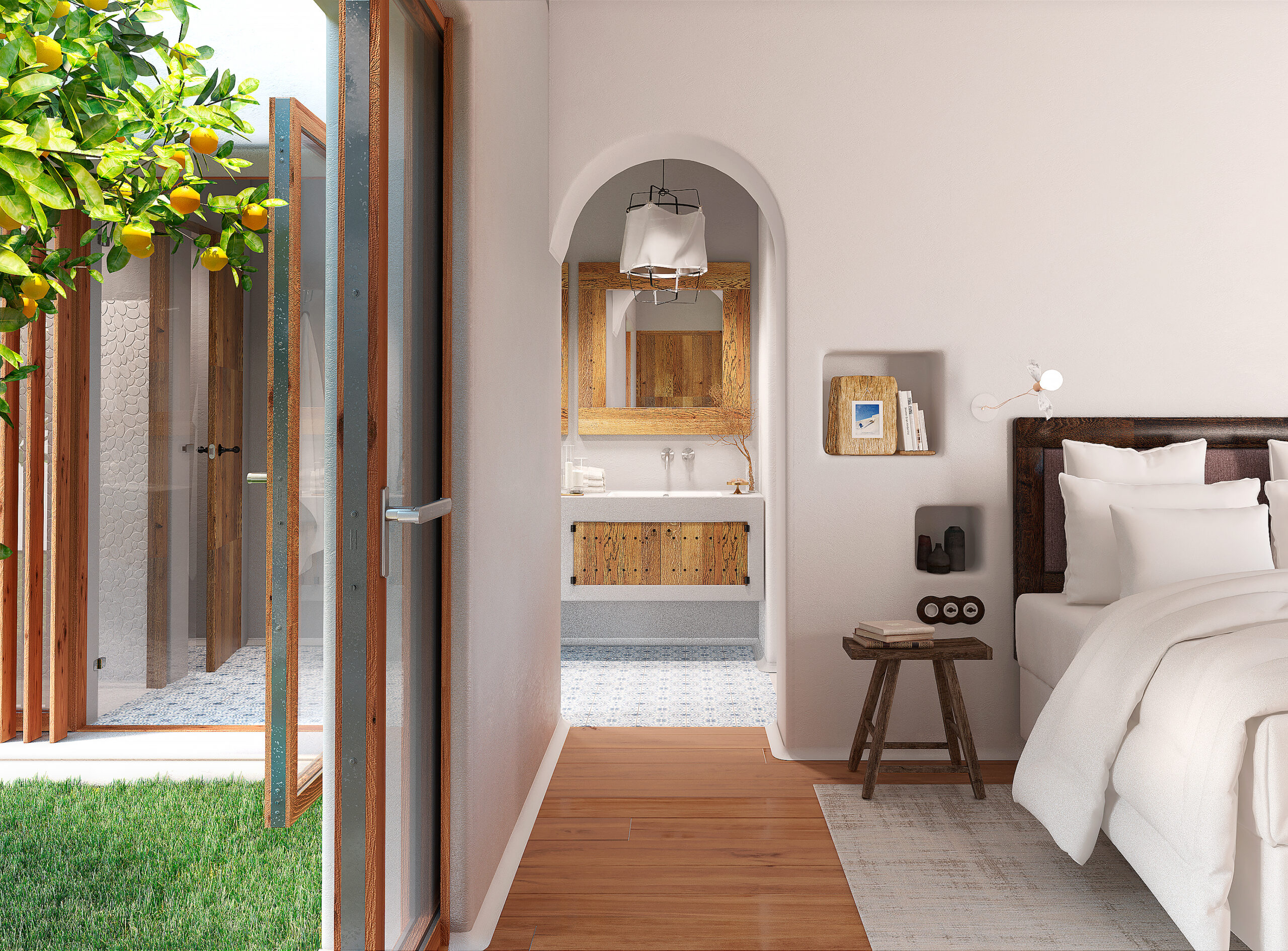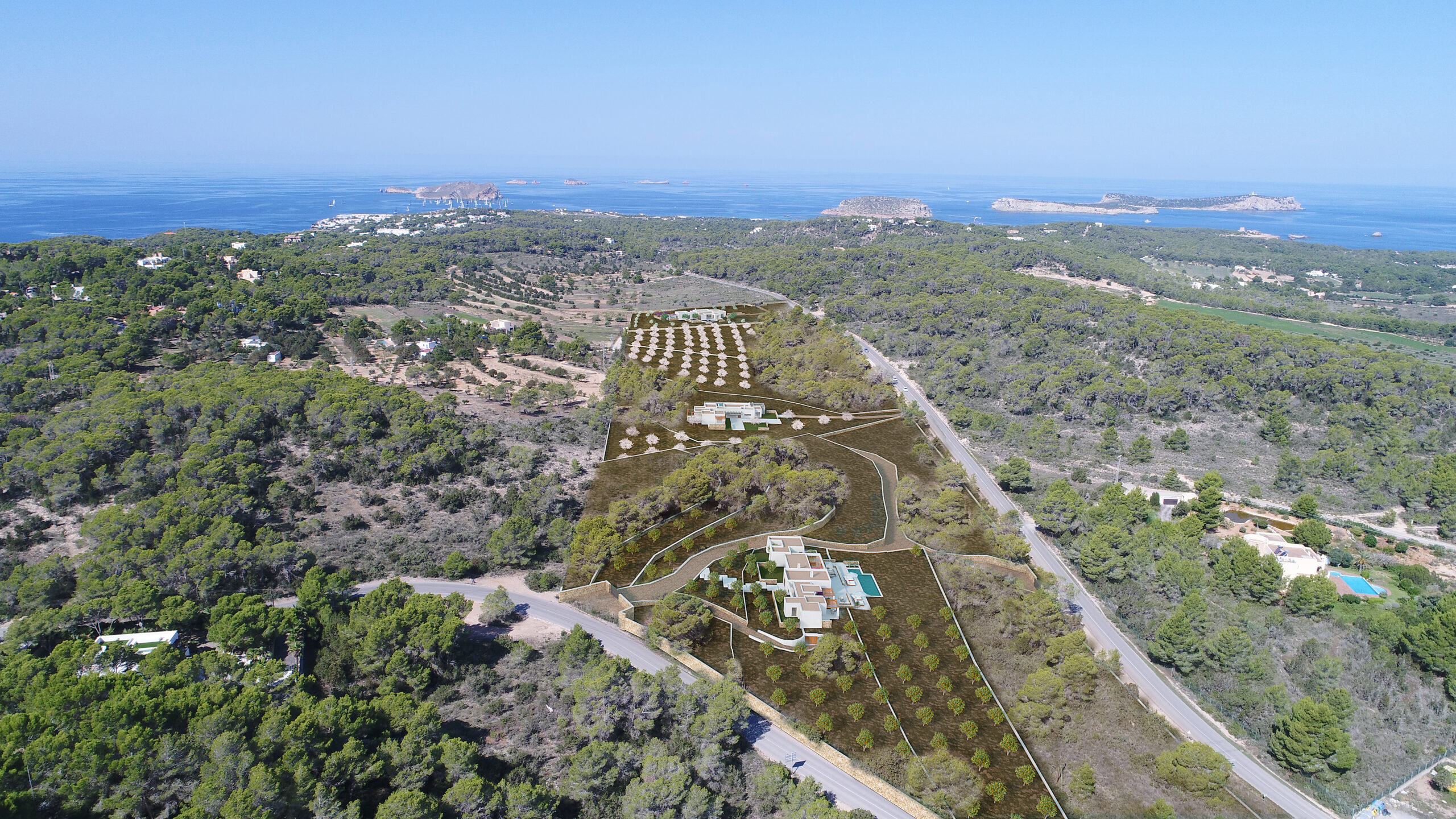 Situadas en el privilegiado entorno de Cala Conta, estas tres villas —Los Naranjos, Los Olivos y Los Almendros— nacen de la inspiración en el paisaje rural ibicenco y en la autenticidad del campo mediterráneo. Cada una de ellas refleja un carácter propio vinculado a la naturaleza que les da nombre, creando un conjunto coherente, sereno y lleno de identidad. Diseñadas en una sola planta, las viviendas se abren al exterior mediante grandes ventanales que conectan los espacios interiores con los jardines privados y las vistas del entorno.